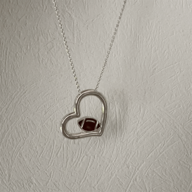 Tailgating, tackles, and touchdowns. Wear your heart on your sleeve with this perfect football heart necklace.